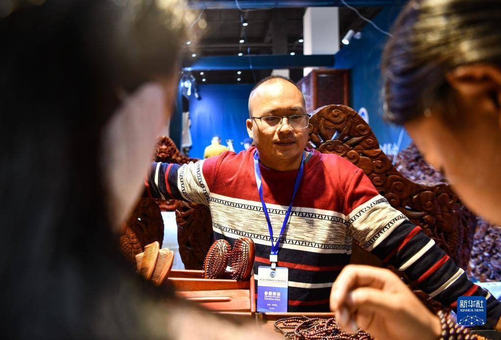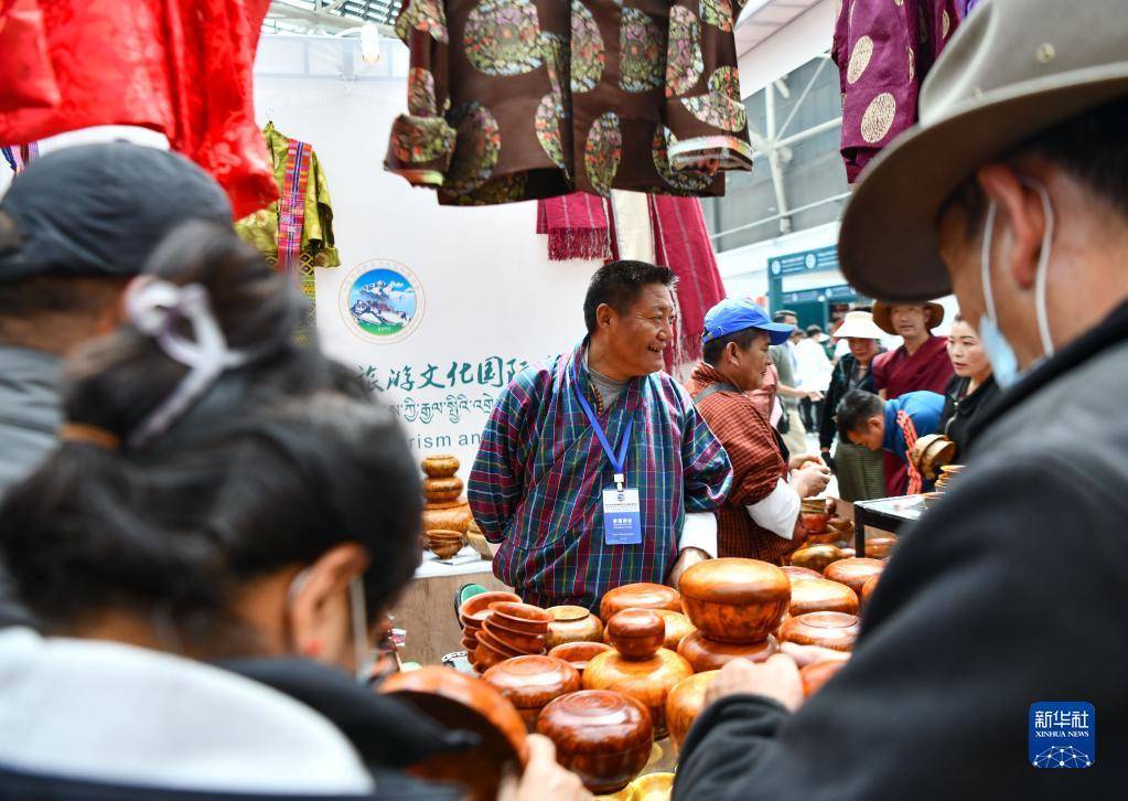展会上的不丹商人向顾客销售不丹服装和木碗(6月18日摄)。