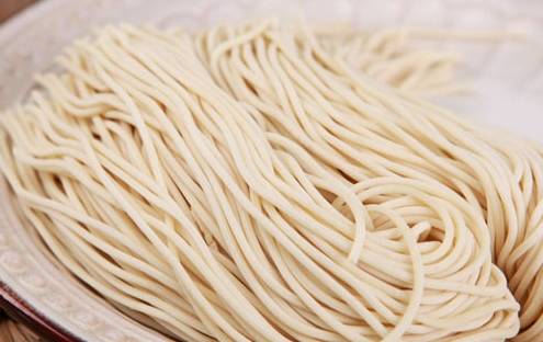 做法很简单,取面粉5千克,加入盐20克、食用碱30克混合均匀,注入清水2-2.2千克,和成均匀的碱水面团,用压面机压好面团,用面条机做出面条。取面条放入沸水中,沸水滚两滚后捞出面条,控干水分,平摊在案板上,先用电风扇将面条吹凉,再用刷子在面条上刷上一层薄薄的菜子油拌匀,分成若干份即可。