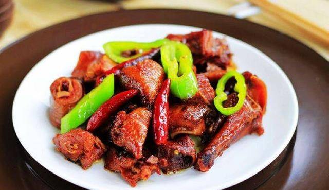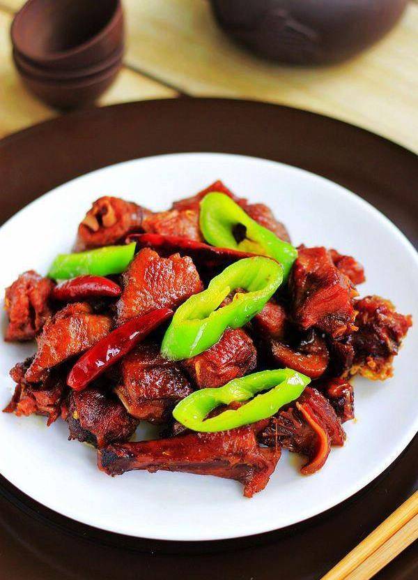 4、加水、冰糖没过板鸭,大火烧开,转小火烧40分钟左右,烧到板鸭熟了,加青辣椒翻炒一会出香味,大火收汁即可