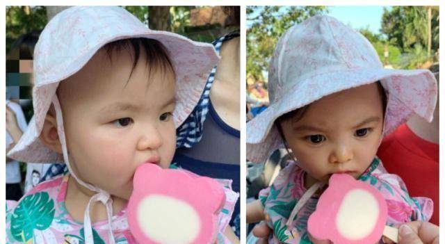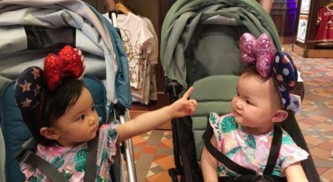 两口子的穿着打扮都很简单,但是怀里的两个小宝贝穿的就非常的漂亮了。可爱的儿童遮阳帽搭配上小碎花裙子,让两个小可爱显得非常招人喜欢。水汪汪的大眼睛,忽闪忽闪的,像极了妈妈熊黛林的眉目。看来两个小可爱完全遗传了妈妈的优秀基因。