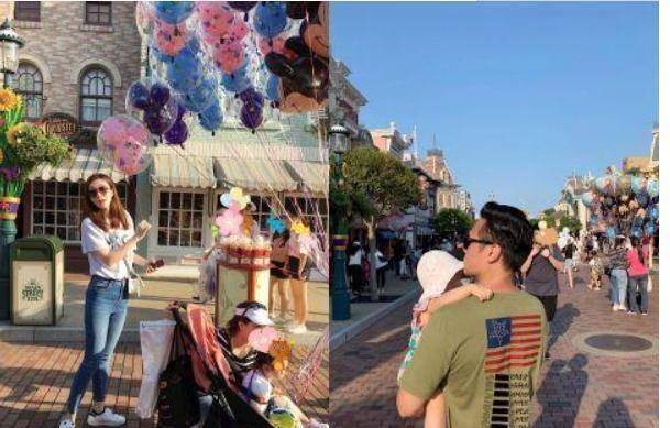 熊黛林一家四口游迪士尼,女儿戴着遮阳帽好萌,熊黛林大秀好身材