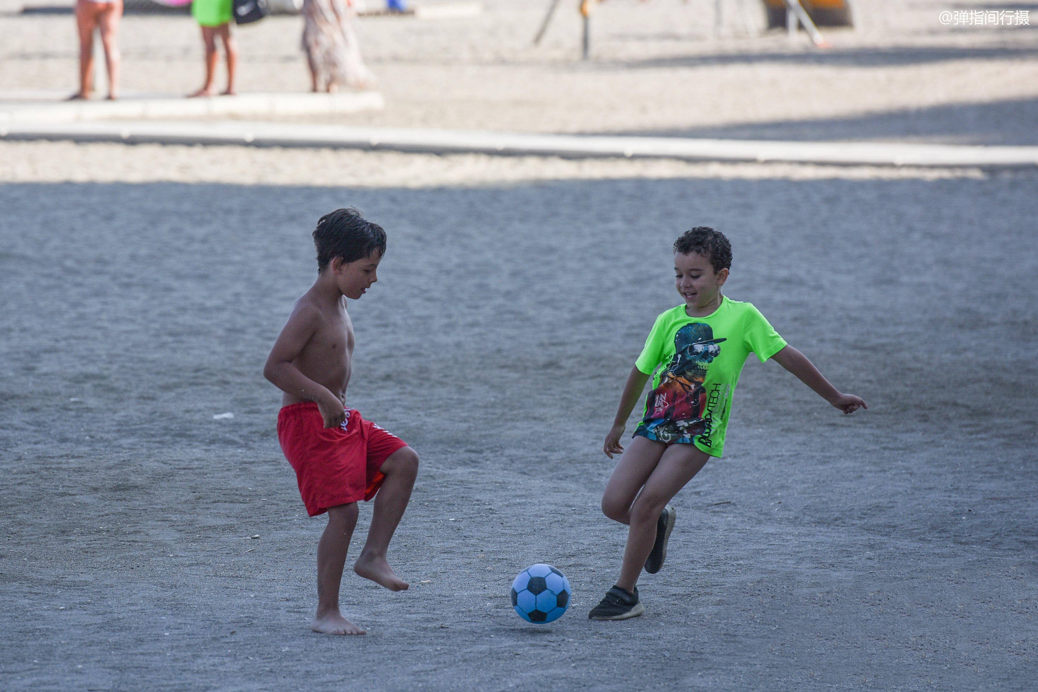 在马拉格塔海滩,男女老少、胖瘦美丑,每个人都在忘情地享受地中海的休闲时光。就连小朋友也在自由自在地展现自我,在海滩上尽情玩耍踢球,一招一式,很有范儿,足球果然要从娃娃抓起。