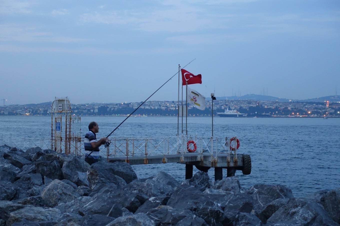 傍晚的博斯普鲁斯海峡岸边,遇到个钓鱼大爷,还有些年轻人坐在大石头上喝啤酒聊天。