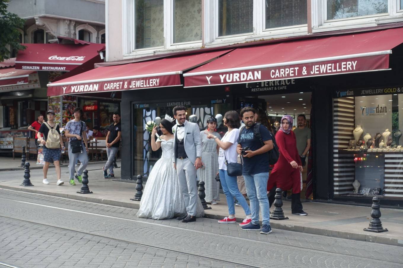 看到想在马路中间拍婚纱照的新人。