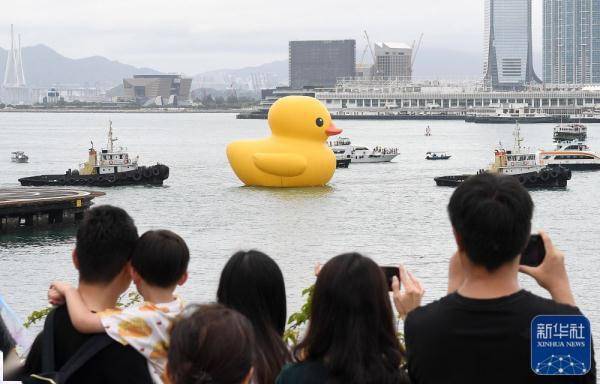 当日,一只“大黄鸭”巡游维多利亚港,吸引众多市民游客前来道别。两只“大黄鸭”6月10日起在维港中环海面与公众正式见面,共展出9天。