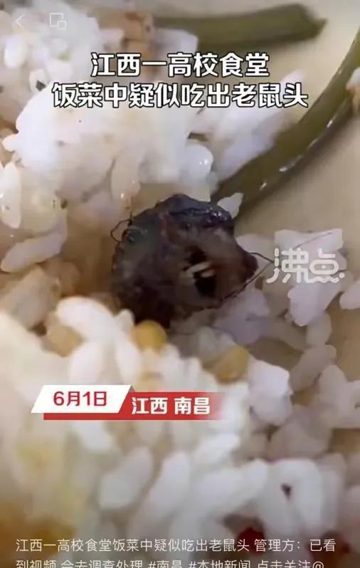 6月1号,江西工业职业技术学院学生在食堂吃饭时,饭菜中出现一个形似老鼠头的异物,大众一致认为,那就是个老鼠头。