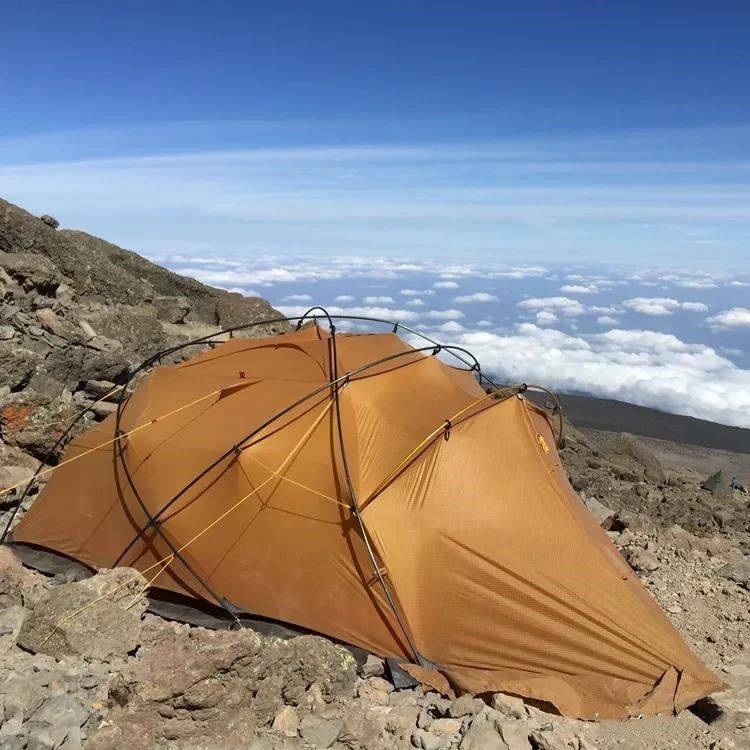 在高海拔山上(如雪山)使用的帐篷,一般采用经过防水处理的防撕裂面料制作,雪裙设计,提供优越的防雨防风保护;铝合金帐杆,使帐篷稳定而坚固。