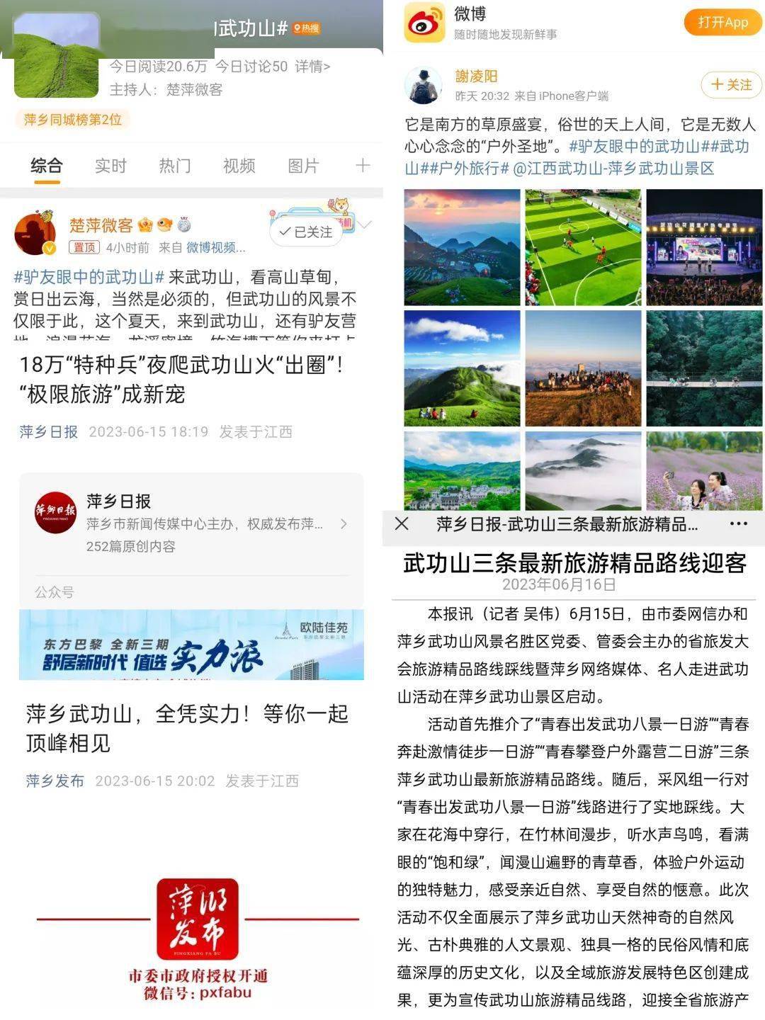 随着旅发大会旅游精品路线踩线暨萍乡网络媒体、名人走进武功山活动成功举办。30多家媒体代表和市内多位知名网络达人在网络上通过图文、视频、直播等全媒体方式开展宣传报道,短短一天微博话题点击量达到20余万次, “驴友眼中的武功山”引发了热烈讨论。
