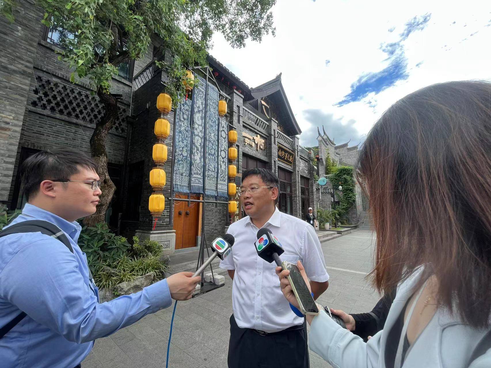 △香港无线电视台和澳门广播电视股份有限公司记者正在采访苏仙区文旅广体局党组书记李仁鸿,摄影王丽姣。