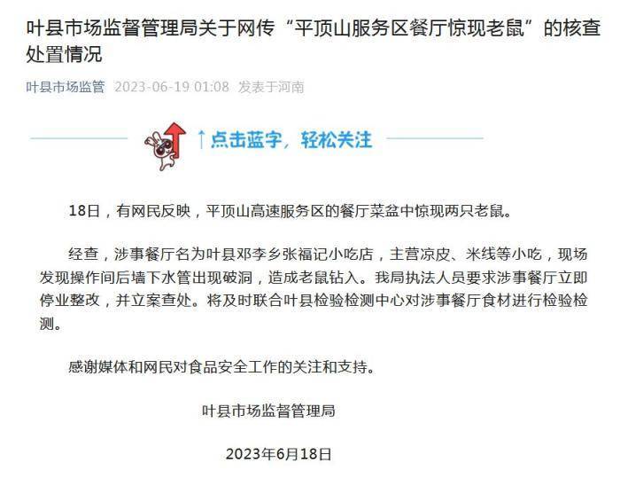 中新网6月19日电 据“叶县市场监管”微信公众号消息,河南省平顶山市叶县市场监督管理局19日通报关于网传“平顶山服务区餐厅惊现老鼠”的核查处置情况。