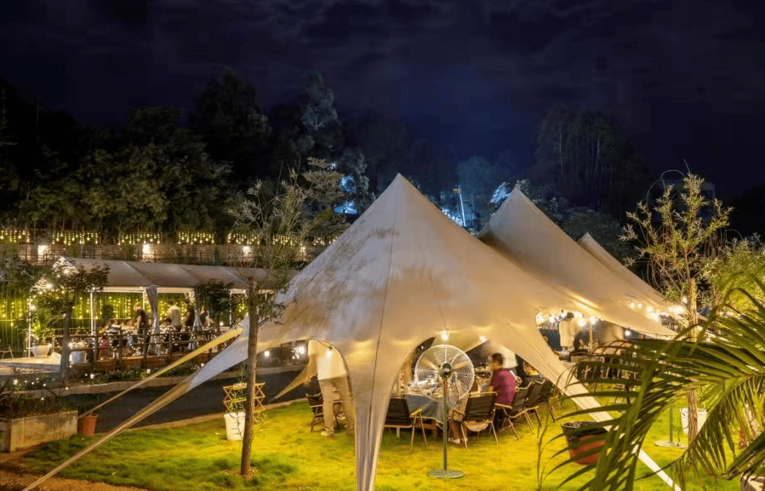 北帝山山地旅游运动大本营位于广西贵港市平南县大鹏镇,是集运动、康养、休闲、度假、文化、旅居为一体的国际化山地运动康养旅游营地。野奢帐篷区根据星级酒店的标准来打造,共有50间野奢帐篷和一个帐篷餐厅,客房共计101个床位。帐篷餐厅依托居中的位置,呈现全景观的基本面,全天候为宾客提供三餐国际化标准的自助式美食,以西餐烘焙、咖啡轻食为主,可容纳120人同时就餐。