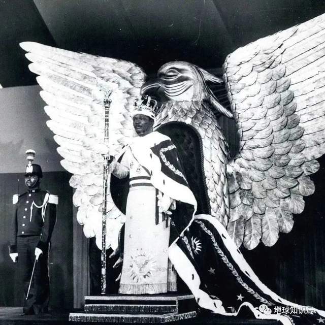 1972年,博卡萨皇帝站在加冕的金鹰宝座前
