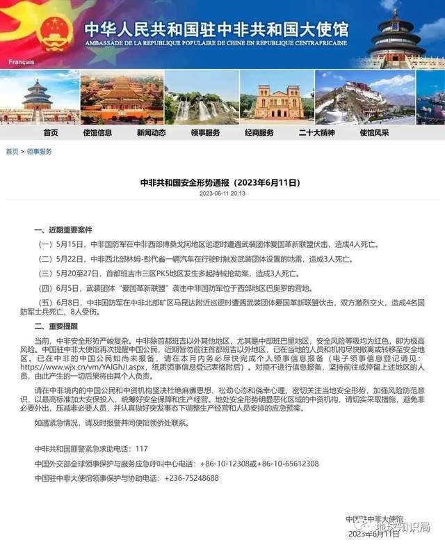 6月11日,我国驻中非大使馆发布“中非共和国安全形势通报”,通报指出:近期中非国防军与反对派武装“爱国革新联盟”多次发生冲突,当前中非安全形势严峻复杂,提醒中国公民暂勿前往首都班吉以外的其他地区。