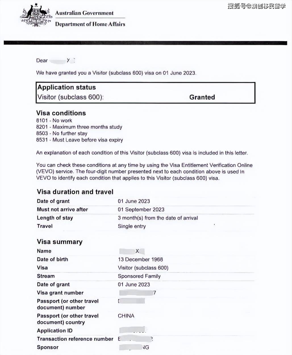 恭喜X先生获得澳洲600签证(亲属担保类)