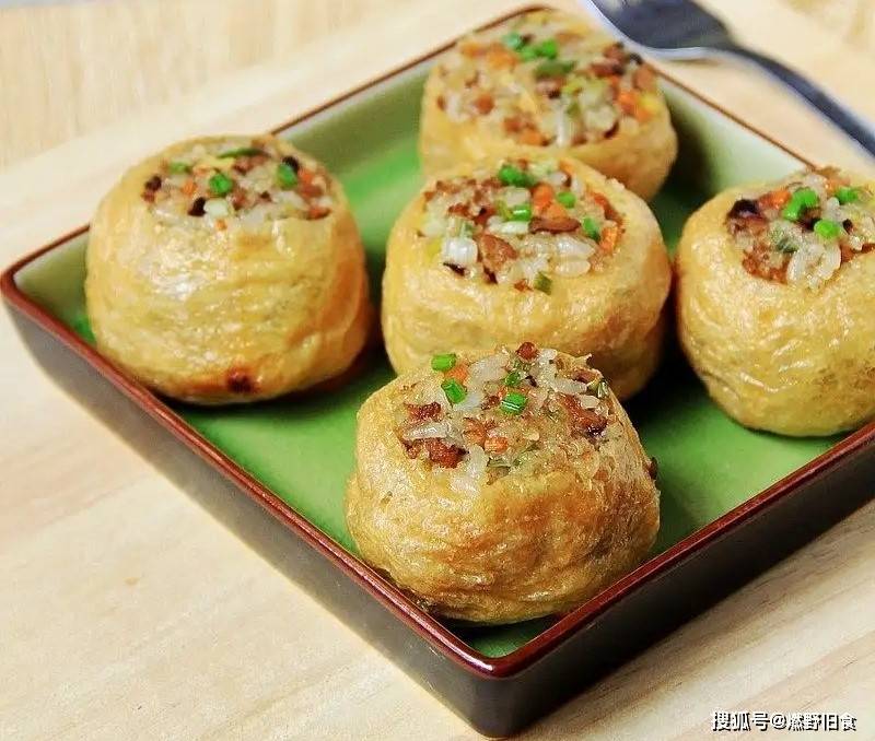 酿豆腐是把豆腐切成三角块,投入油锅中炸,之后取出沥干,再切开,在里面放入各种半熟的佐料,吃时再撒上些胡椒面、葱花,味道鲜美。