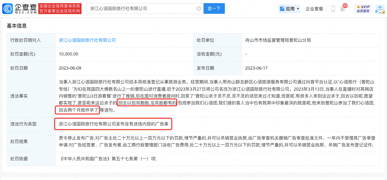 企查查APP显示,近日,浙江心语国际旅行社有限公司因发布含有迷信内容的广告被舟山市市场监督管理局普陀山分局行政处罚1万元。处罚详情显示,当事人在直播时对其网店内销售的“普陀山3日游套餐”进行推销,后在面对消费者提问时,宣称普陀山求子愿望都实现了,甚至回去以后双胞胎、龙凤胎都有。参加心语团回去两个月就怀孕了等。