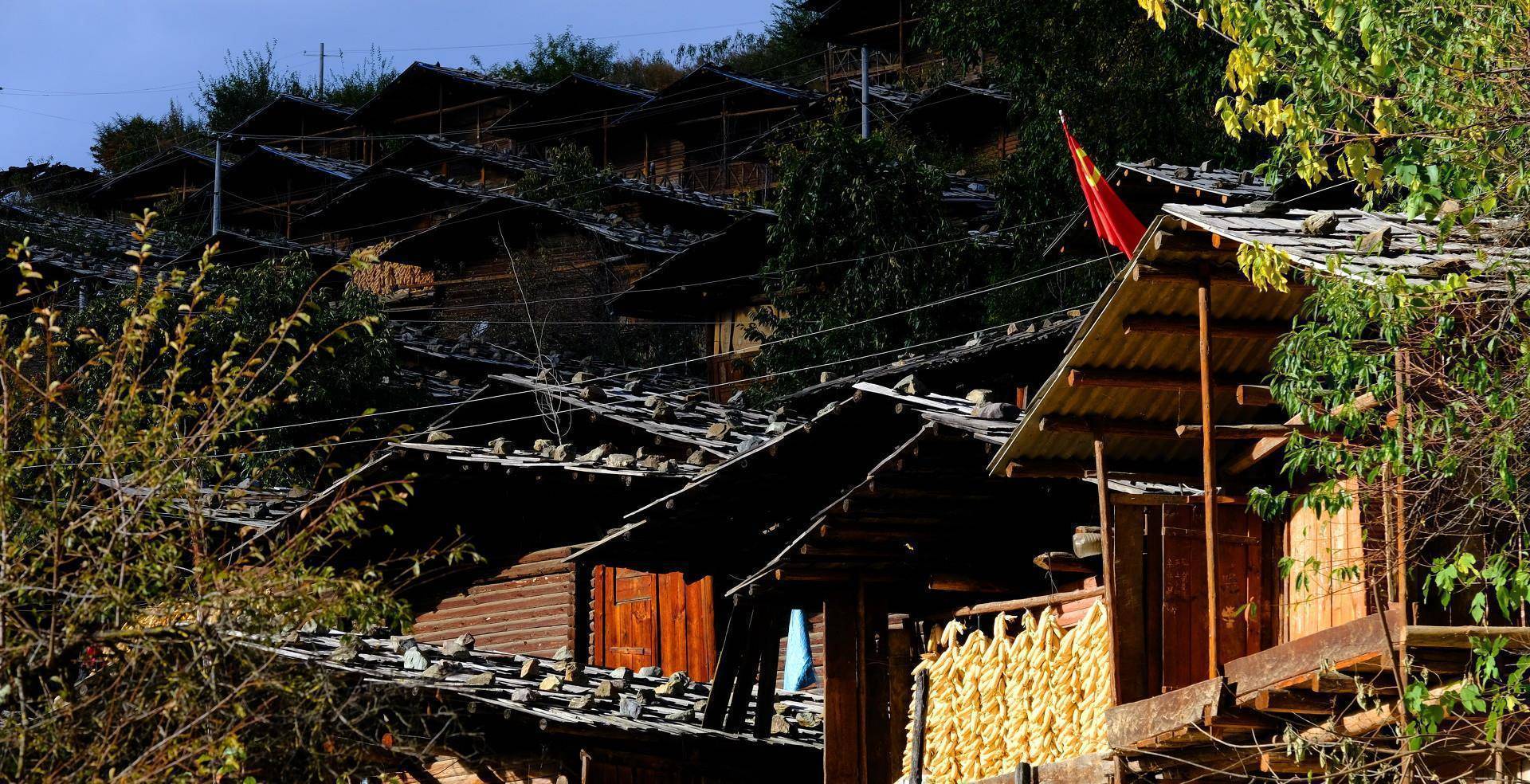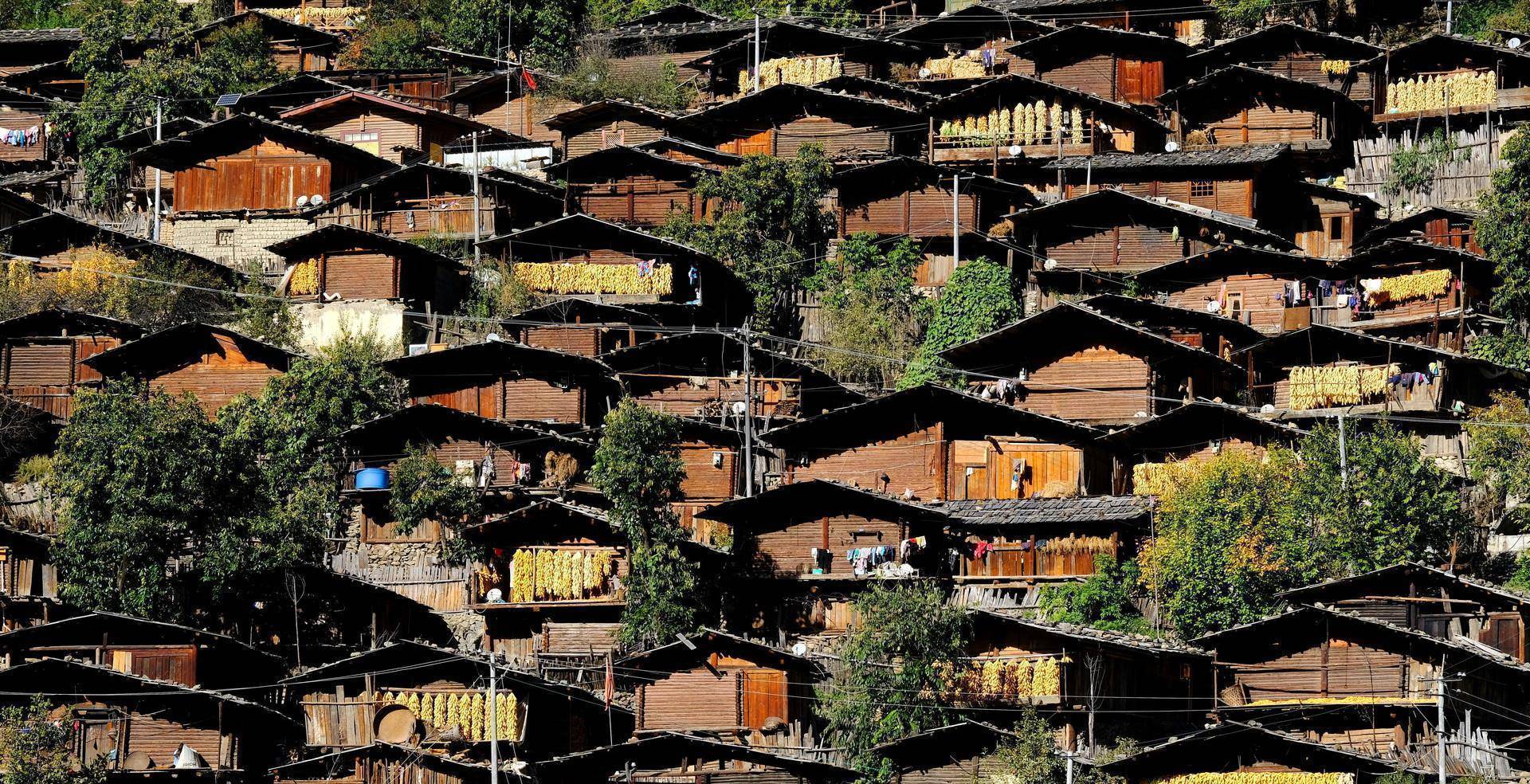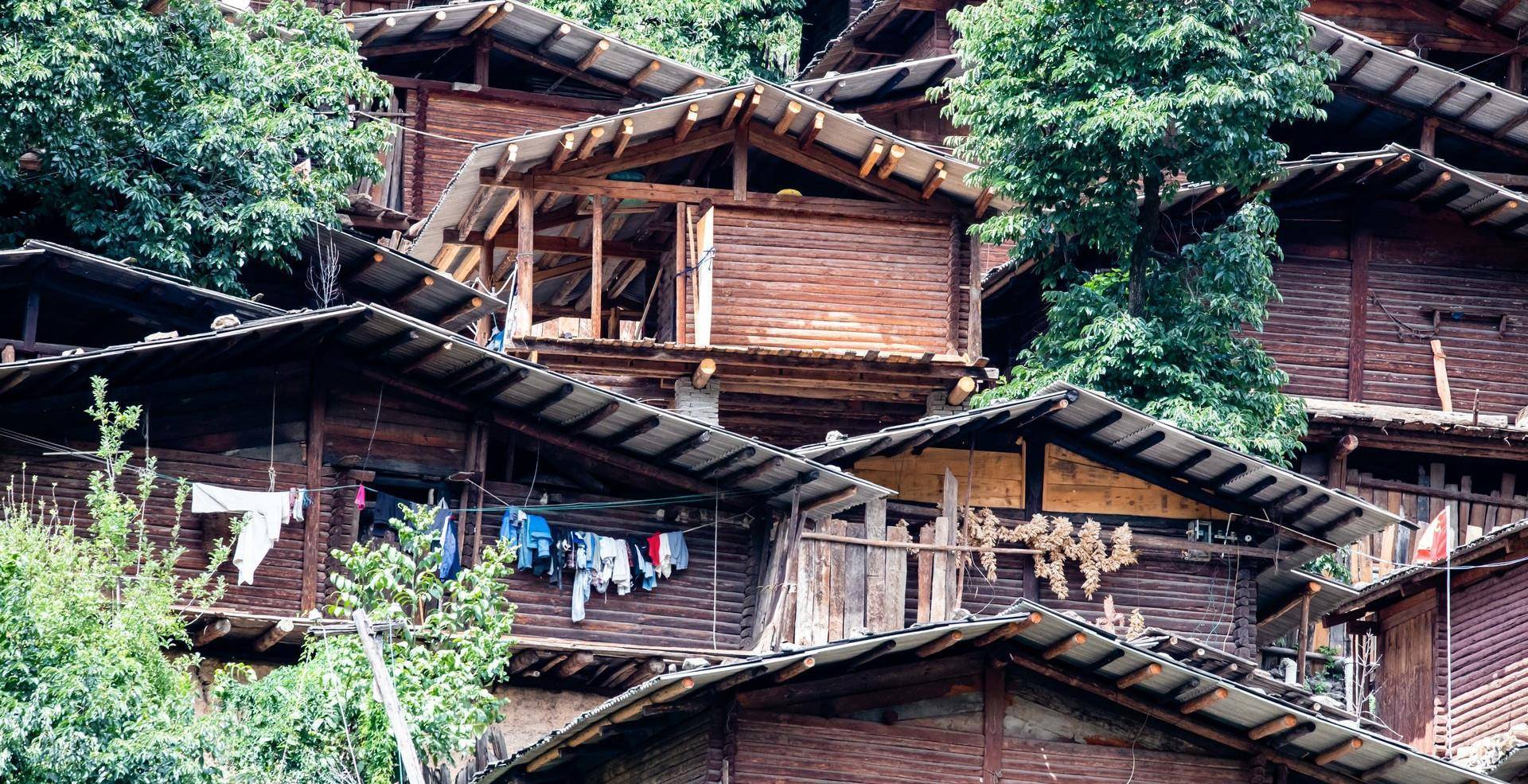 整个村寨修建在半山腰上,是一座典型的傈僳族村寨,整个村寨只有一百零六户居民,基本都是傈僳族人,也是维西县最古老的傈僳族山寨。村寨有房屋修建的非常密集,建筑房屋的材料非常特别,不是砖瓦石头,只是使用木头建造,屋顶木板做好之后压上石头便是特色屋顶。