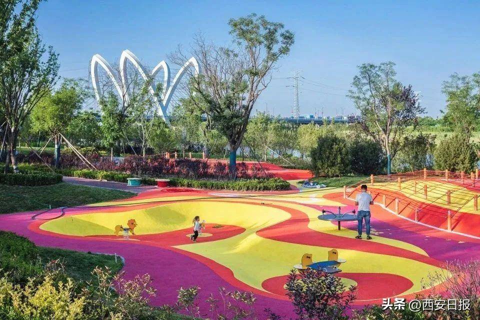 大地艺术景观草海与山水主题景观廊架则采用现代折线手法,山水廊架运用流畅的山水脉络线条,表达场地特有的地域气质,实现景观与艺术的联动;地形起伏的花田,通过流线组织出高点俯视、身在其中、豁然开朗的多重体验。河堤外场地的高差,被用来设置层次鲜明的游乐场空间,让孩子们趣味无穷。少硬质多绿化,少人工多自然,因地制宜、随坡就势,营造大草坪大花海,小水流小活动区,沣河生态湿地公园里还有许多值得“探索”的地方,