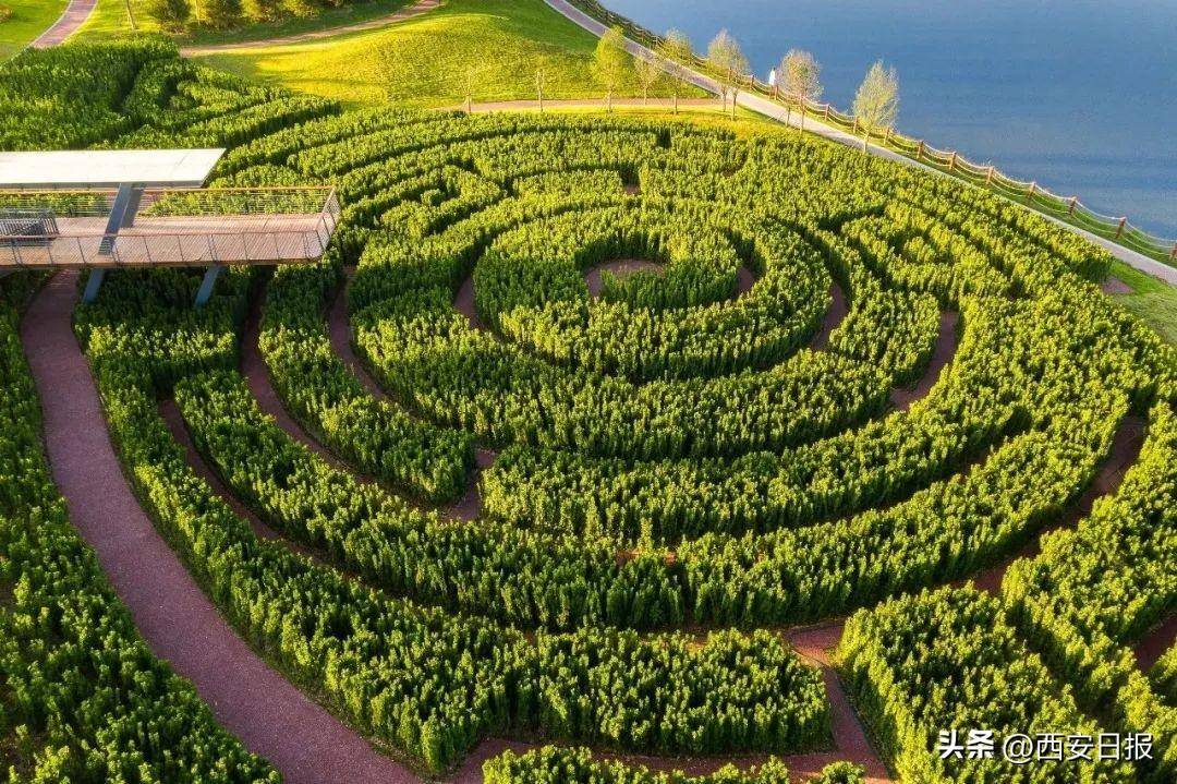 公园地形设计保留了河岸原貌,在保证行洪的前提下设置了多个高低错落的观赏点,沿河岸前行,植物空间、湿地空间和人行步道空间相互交融,站在公园的高处向下俯瞰水畔花海,美如画卷,一处处蕴含着文化元素的景观营造的互动空间,让人忍不住想去体验,沣河流域文化历史悠久,西周时期便沿河两岸建立了丰镐二京。公园的云纹迷宫里,采用了西周青铜器上的云纹和雷纹,用圆形与方形的连续构图展现商周文化,象征对大自然的崇敬。
