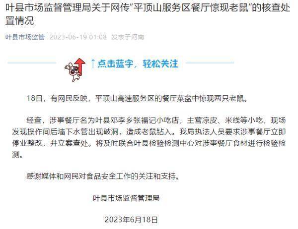 6月18日,河南平顶山,有网友发视频称:平顶山服务区的餐厅菜盆中惊现大老鼠。6月19日凌晨,叶县市场监督管理局官方通报:停业整顿,并立案查处!