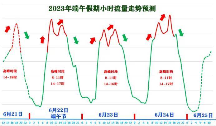 根据大数据分析,2023年端午假期路网流量将呈现以下特点:路网流量整体呈“M”型走势,与往年基本一致。其中,6月21日15时开始路网车流整体上升;6月22日(端午节)8时至11时为出城高峰;6月24日14至20时,为返程高峰;6月25日恢复到日常水平。