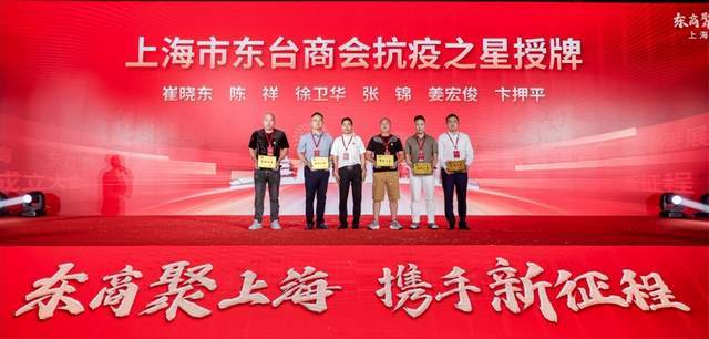 会长范文兵为商会抗疫之星崔晓东、陈祥、徐卫华、张锦、姜宏俊、卞押平授牌。