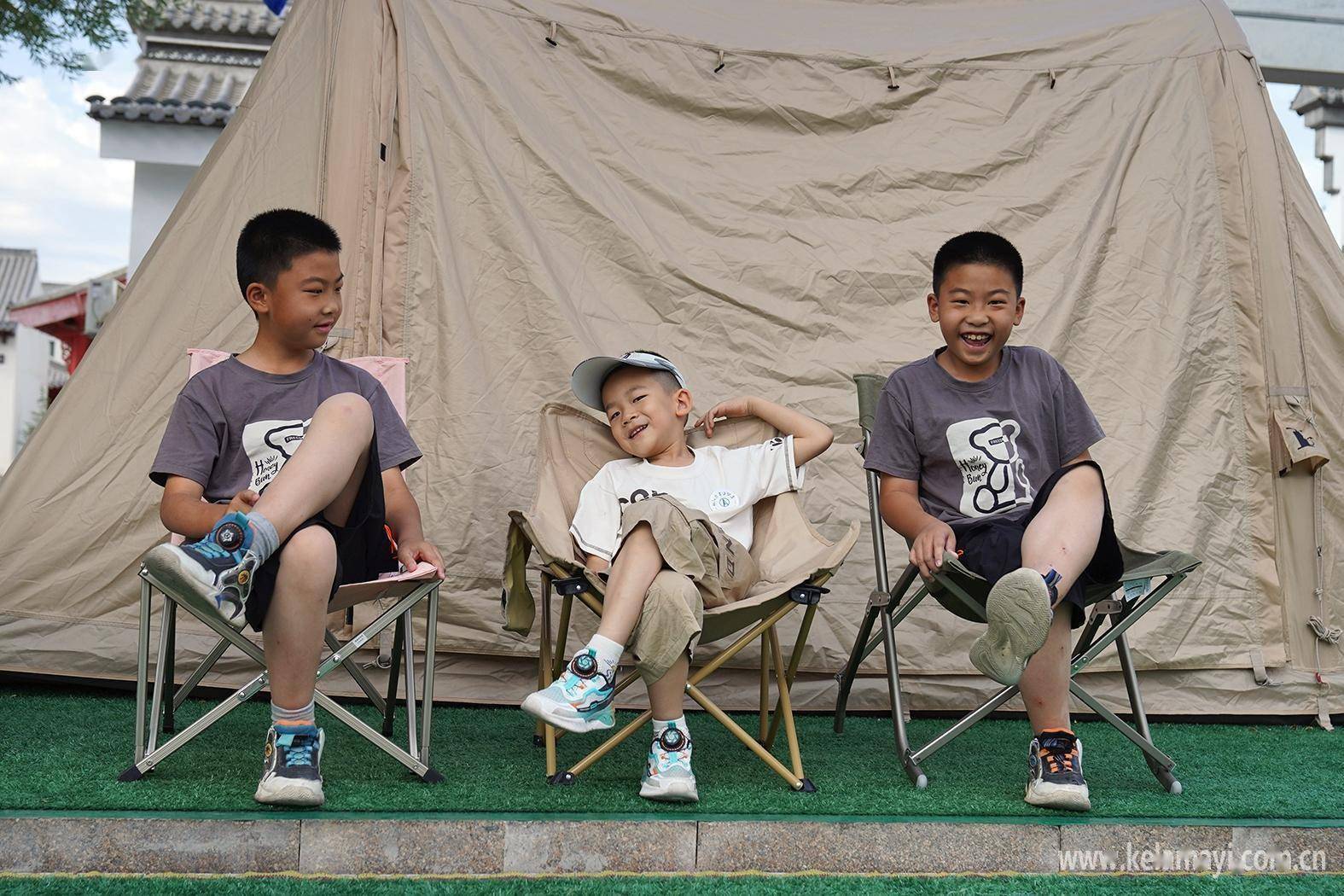 3位小游客在帐篷外试坐户外椅。克拉玛依日报全媒体记者 李浩然 摄
