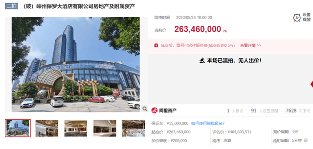 5月24日,阿里拍卖网消息显示,嵊州保罗大酒店有限公司房地产及附属资产因无人出价再次流拍。本次拍卖标的评估价为4.04亿元,起拍价2.63亿元,保证金1500万元,增价幅度为20万元(或整倍数)。