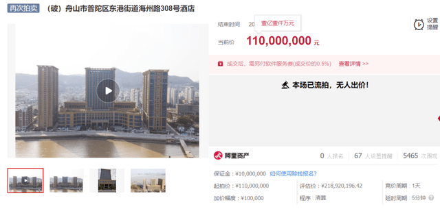 5月19日,据阿里拍卖网消息,舟山市普陀区东港街道海州路308号酒店破产拍卖再度以流拍结束。本场拍卖起拍价1.1亿元,评估价2.19亿元,67人设置提醒,5465次围观,最终因无人出价导致流拍。