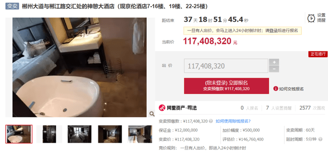 5月25日,据阿里拍卖网消息,郴州大道与郴江路交汇处的神憩大酒店(现京伦酒店7-16楼、19楼、22-25楼)正在进行第三次拍卖,起拍价为1.17亿元,保证金1200万元,标的物评估价为1.47亿元。目前该拍卖信息共有7人设置提醒,2577次围观。