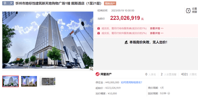 5月19日,据阿里拍卖网消息,忻州市地标性建筑新天地购物广场1幢戴斯酒店(1至21层)因无人出价再度宣告流拍。本次拍卖标的起拍价为2.23亿元,保证金4000万元,加价幅度为1万元(或整倍数)。
