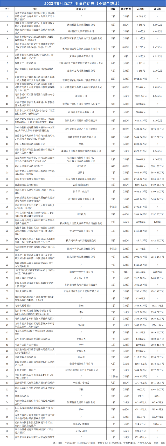 从整个五月来看,新品牌开业签约不断,中高端酒店数量也在持续增长。尽管如此,酒店资产交易市场,拍卖、翻牌速度仍然不减。据闻旅不完全统计,2023年5月,共有59家酒店挂牌拍卖,其中拍卖价格在亿元以上的酒店8家,拍卖价格在5000万元~1亿元的酒店有14家,拍卖价格5000万元以下的酒店37家。截至5月底,已有10家酒店成交。