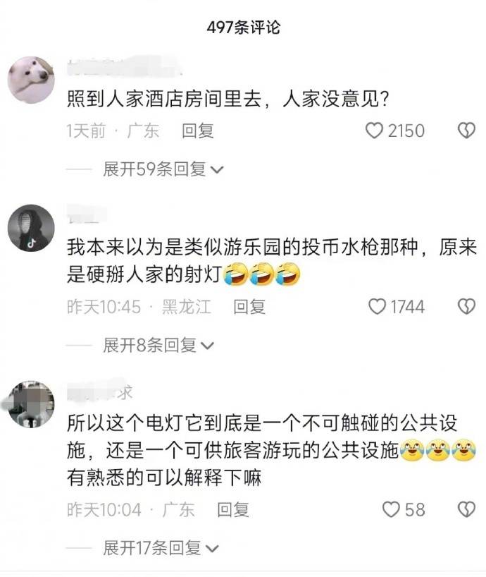 6月19日,上游新闻记者根据郑先生曝光的线索,查看该外地游客的短视频平台账号发现,该游客在6月16日连续发布了3条在陆家嘴夜游视频,其中一条视频以“童心未泯,哈哈哈”为题,记录了她玩大型聚光灯的过程。她用聚光灯直射对面的大楼,一旁女子还指挥她:“照下面,照下面水。”