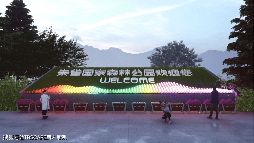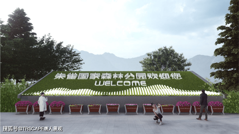 该方案我们将公园名称作为先导视觉符号,以公园自然山景作为背景,以自然山石与砌筑景观墙呼应,以观赏草作为景观点缀,凸显自然野趣氛围。