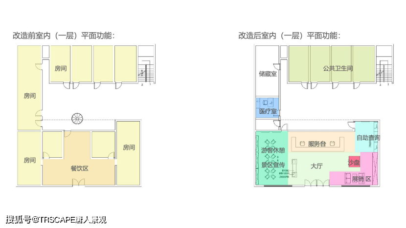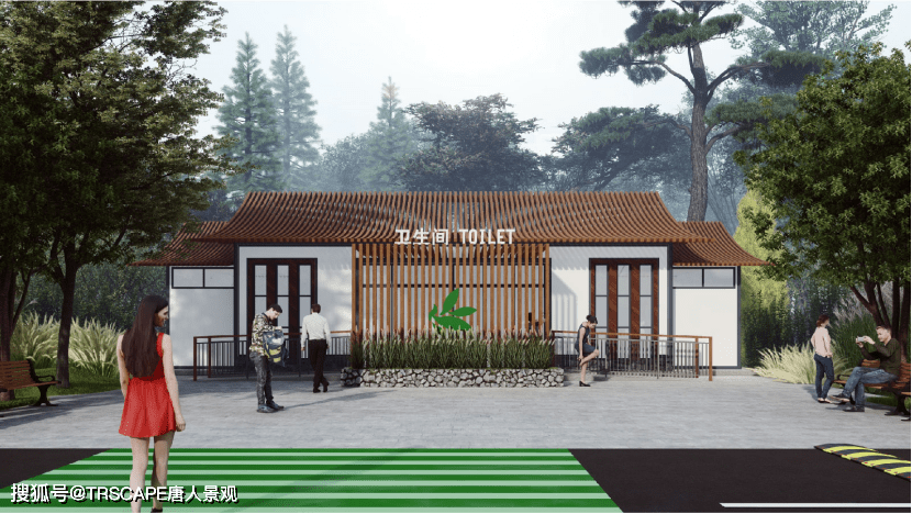 建筑结构外立面不变,通过增加采光面积,提升游客舒适性,增加醒目标识提升景区识别性,从人性化角度考虑为公厕周边场地增加休憩设施。
