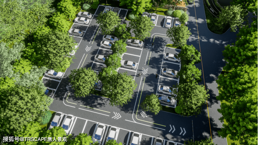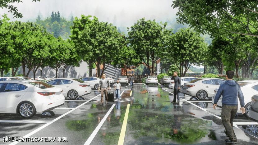 有效利用该空地,作为游客服务中心停车配套设施,停车场内种植林荫树种,起到遮光降温的作用。通道符号化彩绘,增加指引功能。