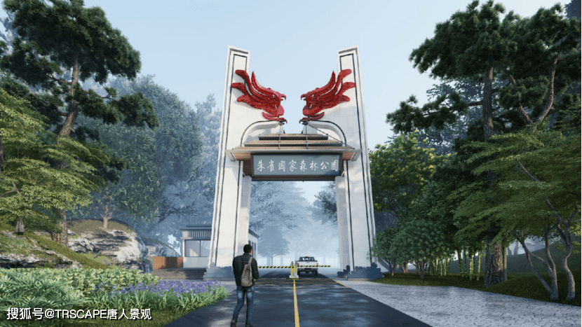 以汉风作为设计主题元素,高耸造型形成迎宾之门的仪式感,对称红色朱雀嵌入造型之上,与公园主题名称遥相呼应。