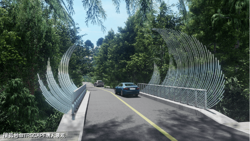 以朱雀羽毛为设计灵感,取其飞翔的姿态,两侧起伏的形态与朱雀森林公园山峦起伏相呼应,在入口处形成了迎宾姿态的框景