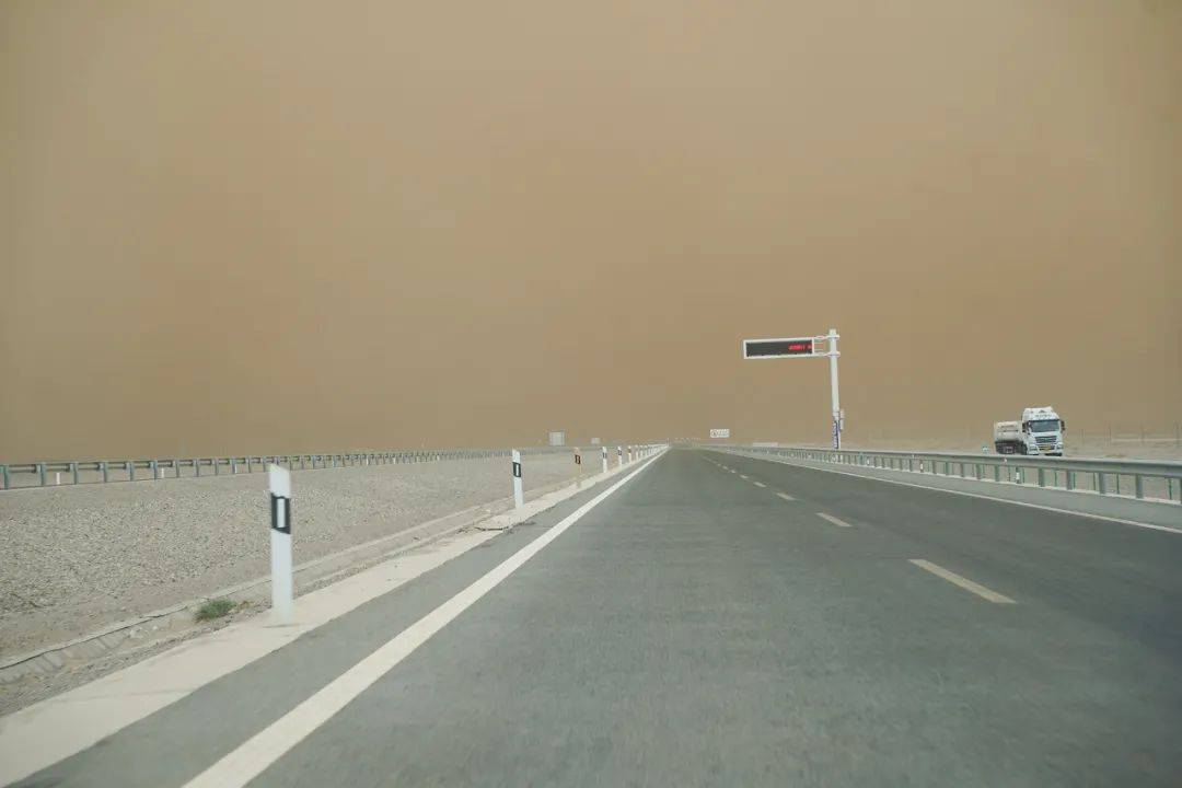 越往前开,风沙越大,可见度逐渐低至1米左右,在高速上开着40迈的速度摸索着前进。此时,很庆幸走得是高速,如果是普通道路,在这样看不清路况的情况下,很容易与大货车发生碰撞事故。而且高速上连小车也很少见到。