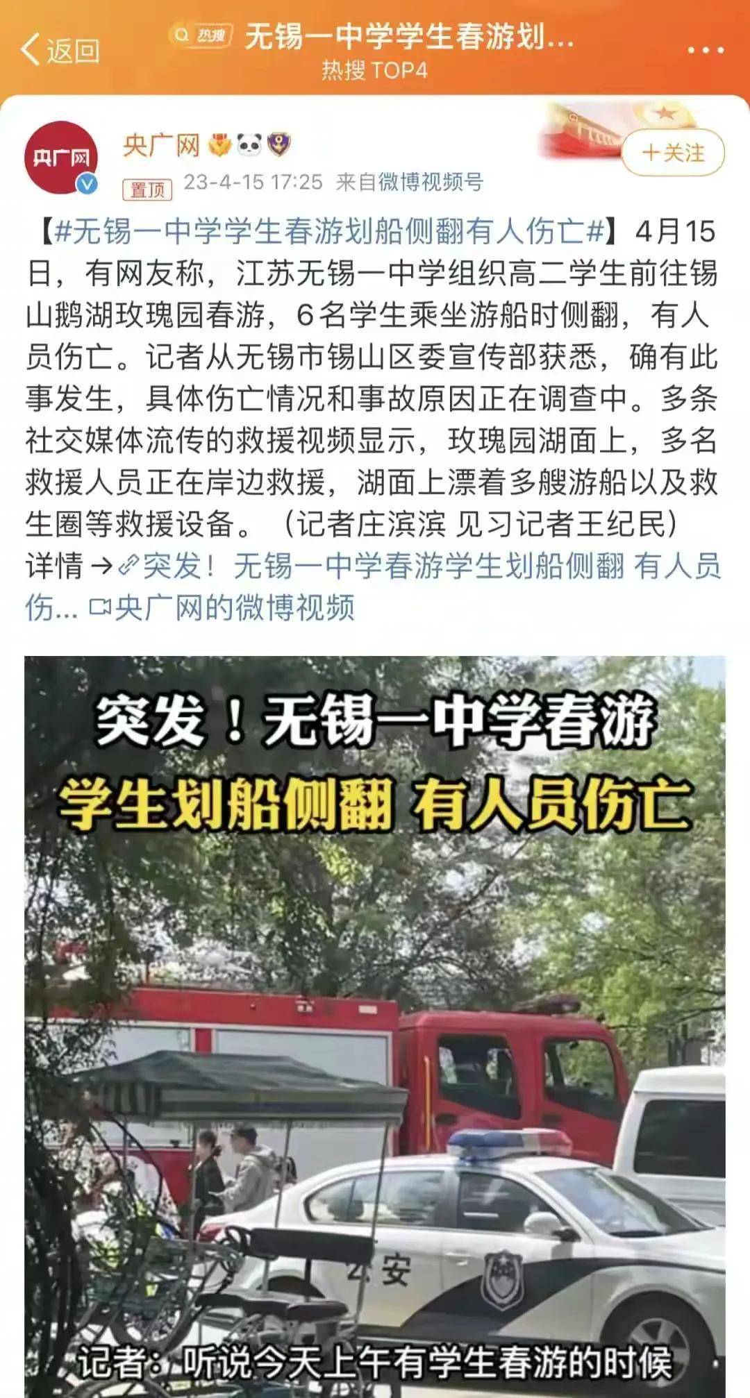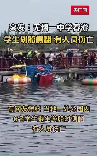 昨天,15号周六,江苏省无锡桥实验学校组织了同学们去西山鹅湖玫瑰园的春游。高中二(3)班的六名学生在乘坐游轮时翻车,六人全部掉入水中。其中4人被现场人员及时救上岸,另有2人因翻船救生衣滑落溺水身亡。