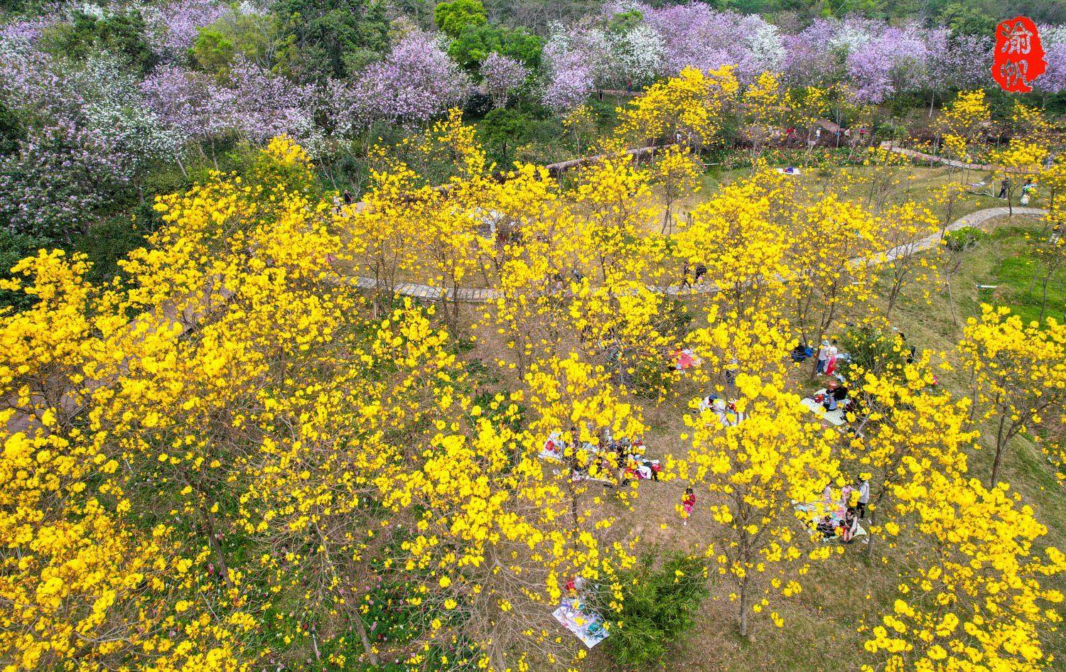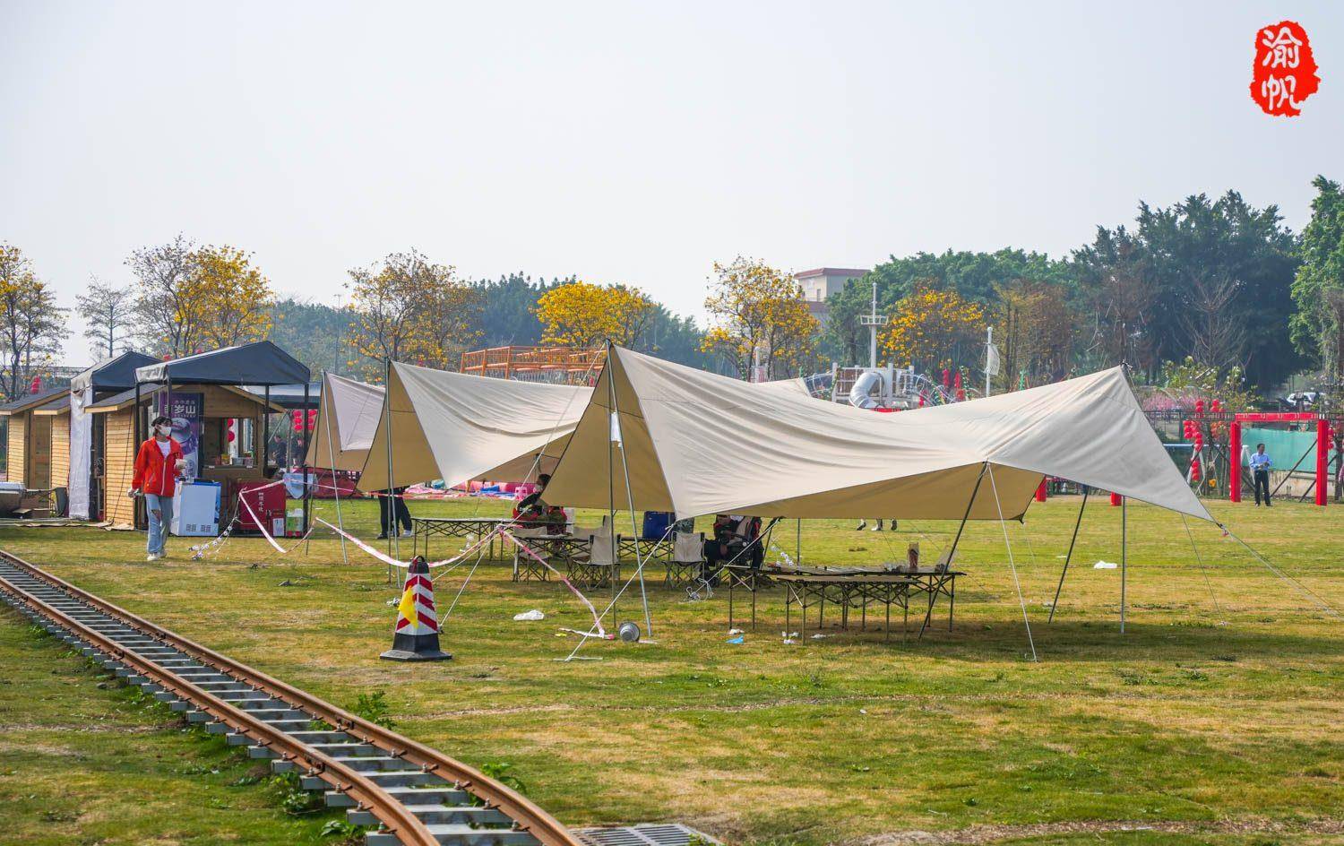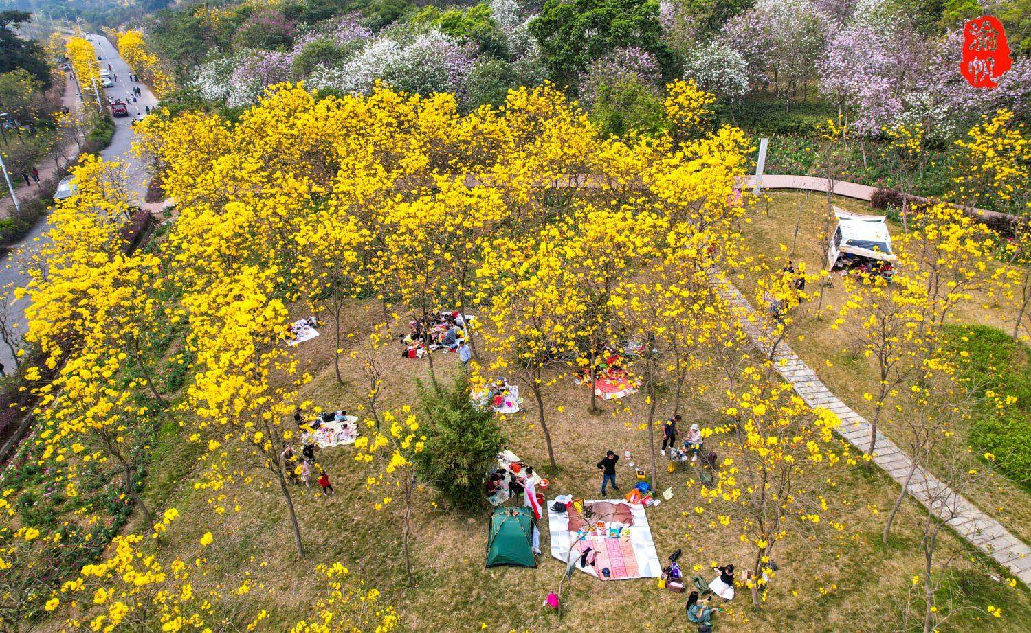 在群山环抱的花海中,西樵山脚下,黄花、风树、红苞下,有帐蓬星。他们有的自带零食分享,有的甚至还有桌子。椅子和烤箱或一家人或三五好友,一起做饭,一起享受美好的周末吧!