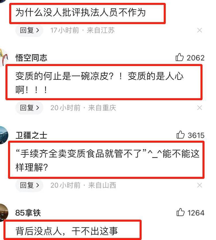 工作人员过来查看,发现凉皮确实坏了。按照说明,治疗非常简单。商店被关闭,损坏的凉皮被处理掉。