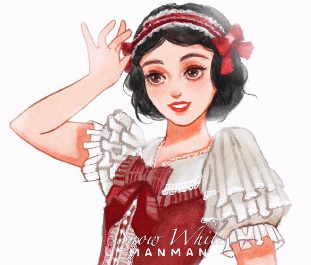 白雪公主身穿红白相间的LO套装。她看起来喜庆而高贵,尤其是头带与她乌黑的头发相配。不知道为什么,看着她的黑发黑眸,我还是觉得舒服。穿汉服应该好看吧?由艺术家安排。