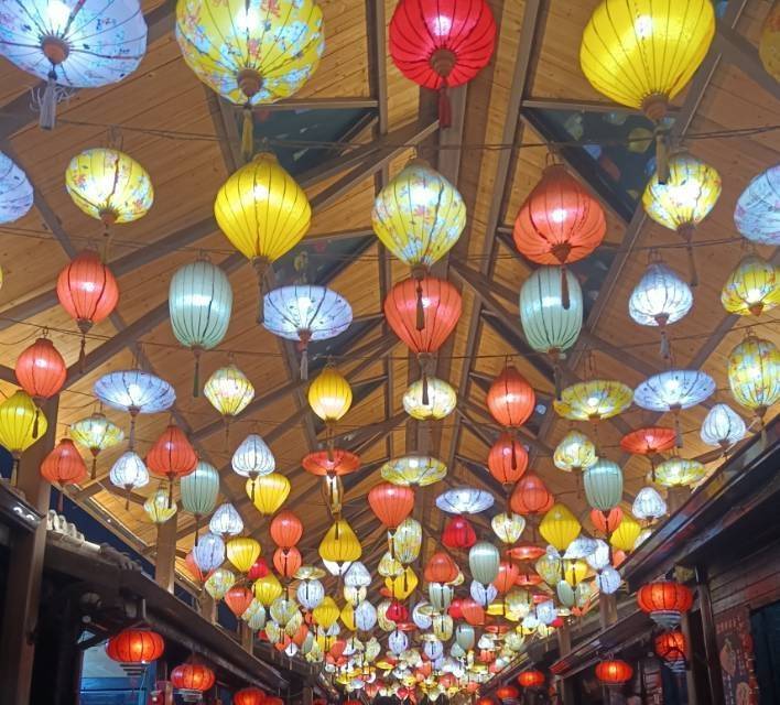映入眼帘的首先是一条全是木质结构房屋的美食街,街道的顶棚被装点上了花纸伞,显得金碧辉煌又韵味十足。