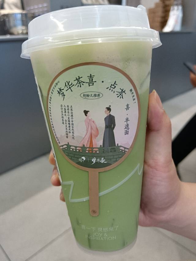 我们上午在江汉路步行街逛吃逛吃,什么烤苕皮、榴莲酥、新疆炒米粉,更特别的是还喝到了当时很火的《梦华录》联名款奶茶。