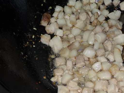 3.大火起锅倒入油,烧热后转小火倒入肉丁翻炒至肉丁成油渣状