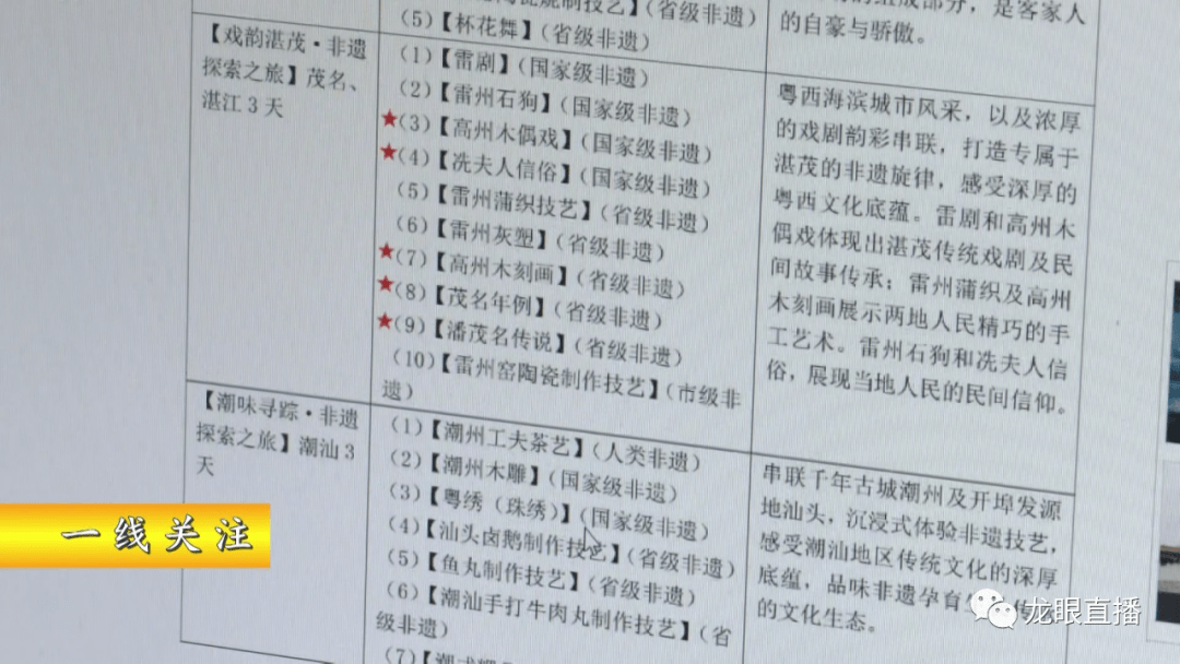 此次推出的10条非遗旅游精品线路包括广州、佛山、东莞、江门、中山、肇庆、茂名、湛江、潮州等12个城市,以“旅游”为载体,有机融入各目的地独具特色的非遗元素。其中,“戏韵湛茂·非遗探索之旅”茂名、湛江3天,包含了高州木偶戏、洗夫人信俗、高州木刻画、茂名年例、潘茂名传说5个茂名非遗项目。