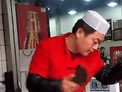 来一个动图,再感受这师傅的强大,抓、甩、开,一气呵气,这得练多久呢!那刀好像不是刀了,像生在他手上的肉一样控制自如,完全是跟上拍子的节奏呢!看到这里,不禁要感叹一下:这年头没有一技之长都不敢抛头露面卖小吃了!