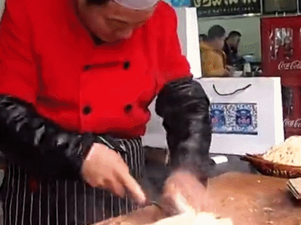 上一个动图感受一下,那刀锋在两手之间游离,碰着了就算他输!而看来,他从来没有输过呢,从这现场的视频看来,这师傅也是好多的经验了吧!不过还是想说一句,师傅请保重你的手,顾客不想没有表演看呢!
