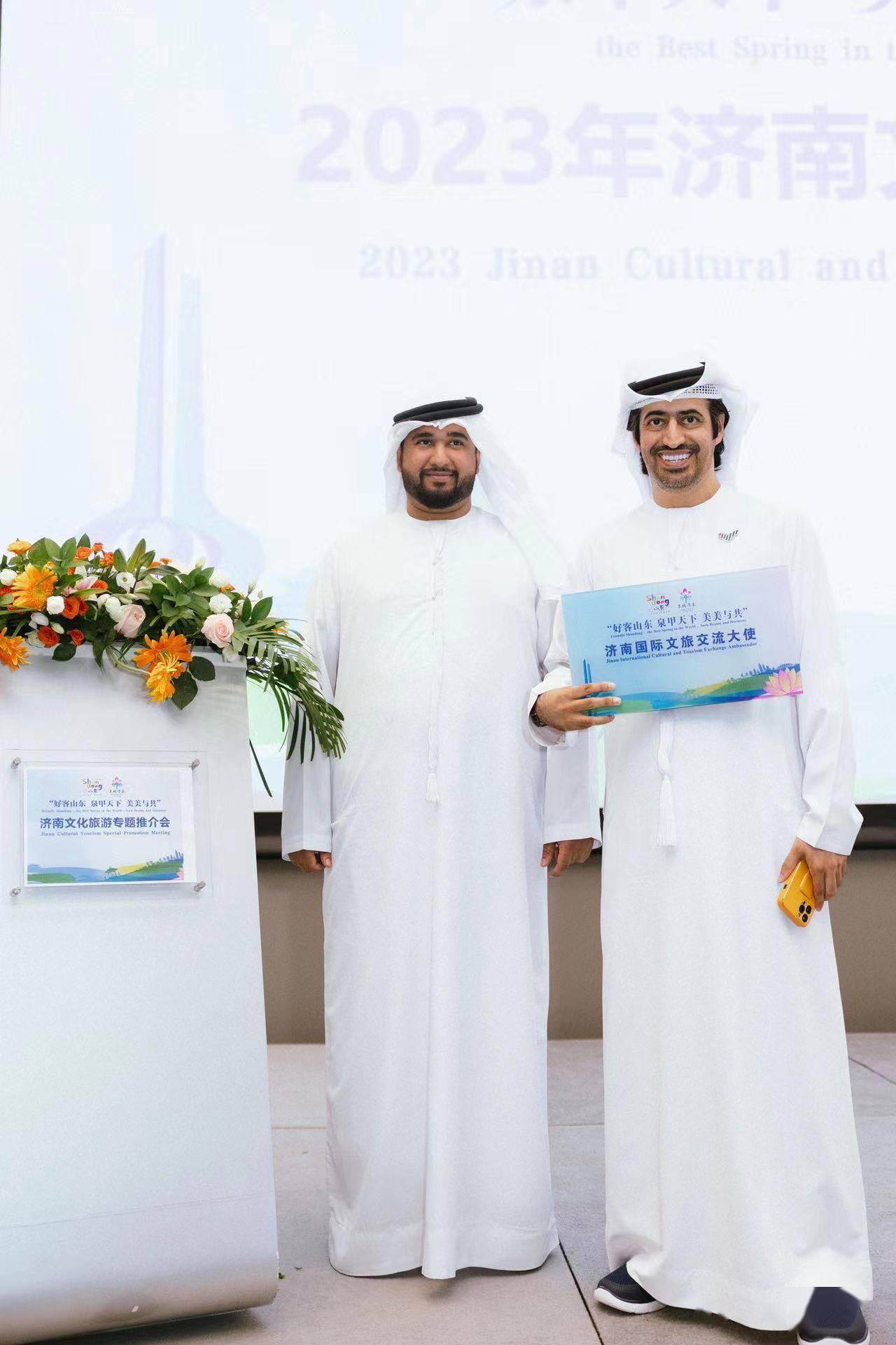 为展示济南丰厚资源,推介会还以视频形式对济南非遗项目以及济南国际传播中心进行了全方位展演,并现场聘任迪拜硅谷绿洲自贸区主席朱马·阿拉木图、阿联酋富吉拉酋长国文化遗产部媒体总监萨中华为“好客山东 泉甲天下 美美与共”济南国际文旅交流大使。同时就与迪拜硅谷中国文化优品展示中心加强交流合作,共同建设海外仓,以及启动“万人游泉城”国际旅游合作项目进行了交流探讨与具体对接。